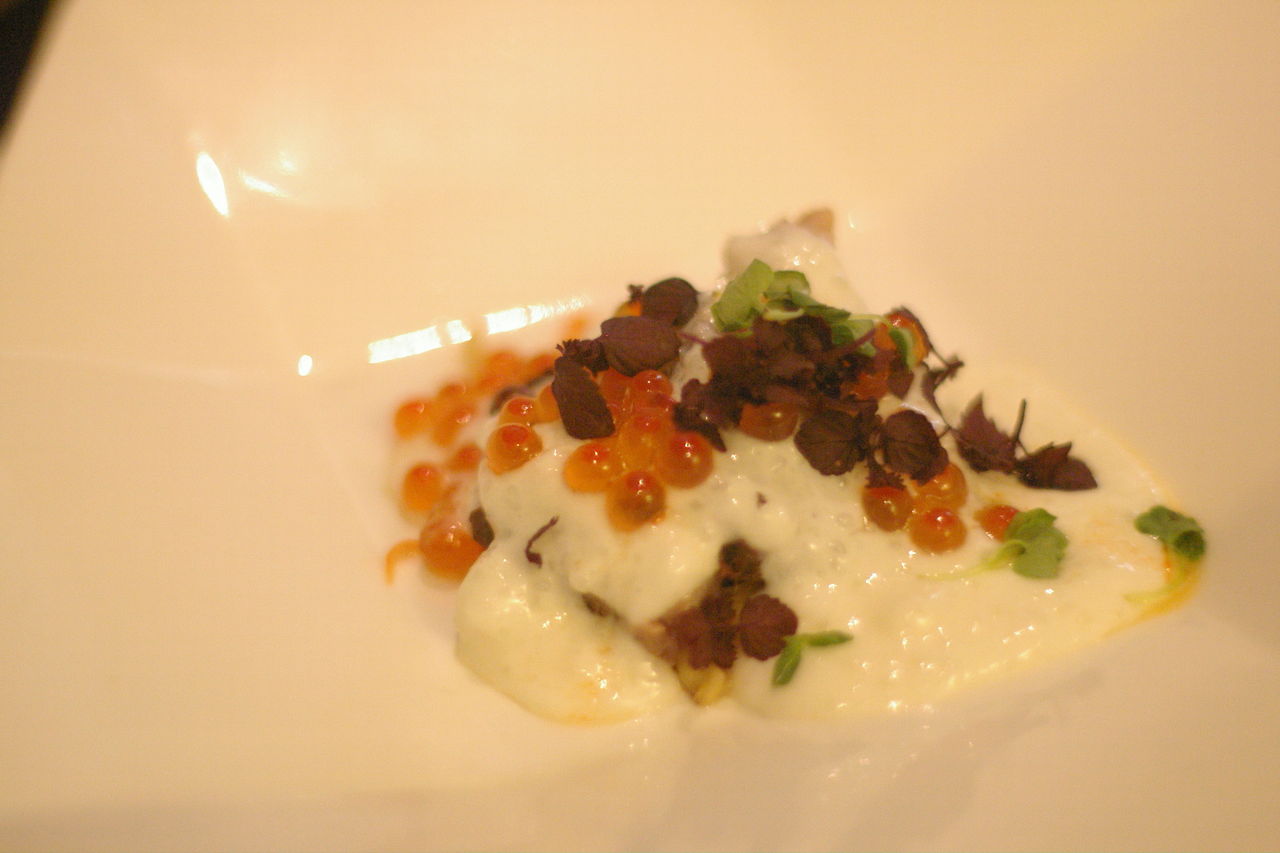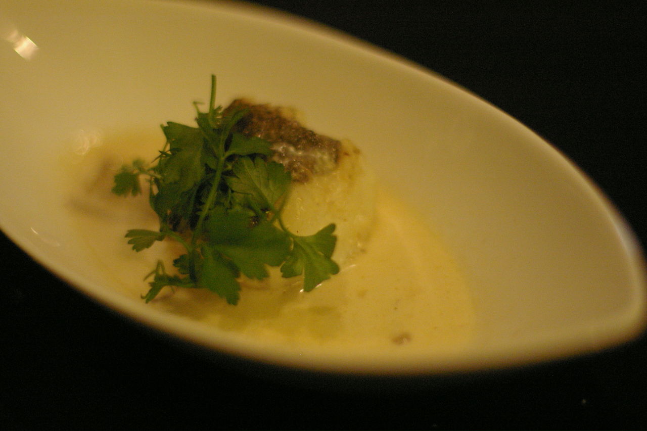 前菜。ハーブの茎でいぶしたカツオにミルク味のリゾットがかかっています。